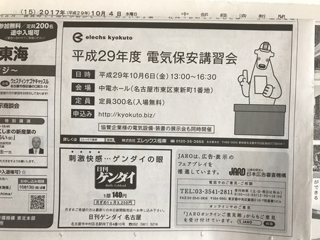 10月4日(水)付、中部経済新聞に電気保安講習会の告知広告が掲載されています。